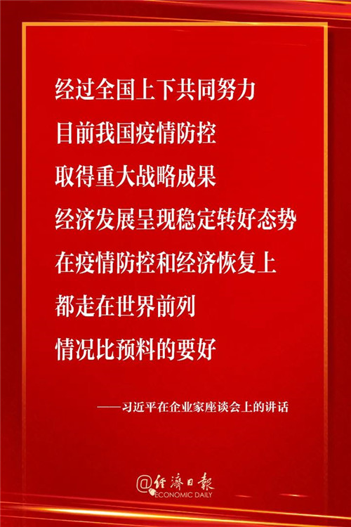 在認真聽取大家發言后,習近平發表了重要講話。他表示,經過全國上下共同努力,目前我國疫情防控取得重大戰略成果,經濟發展呈現穩定轉好態勢,在疫情防控和經濟恢復上都走在世界前列,情況比預料的要好。我們要增強信心、迎難而上,努力把疫情造成的損失補回來,爭取全年經濟發展好成績。